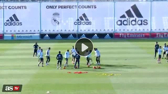 Real Madrid'in İspanyol futbolcusu Alvaro Arbeloa, antrenmanda Isco'nun sırtına çıkmak isterken bir anda yere düştü.
