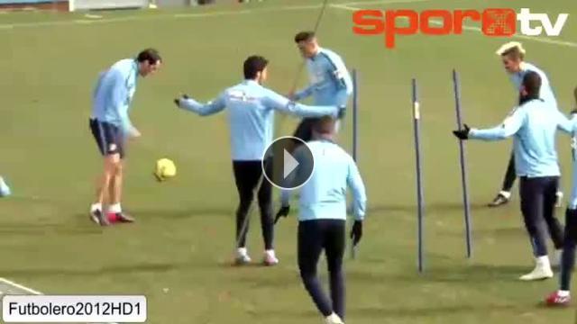 Atletico Madrid idmanından top kapma oyunu oynanırken meşin yuvarlağın Arda Turan'ın bacak arasından geçmesi gülüşmelere yol açtı.