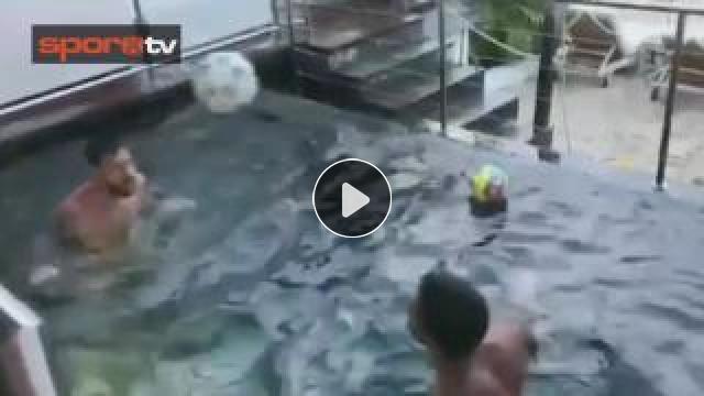 Tatili birlikte geçiren Barcelona'nın yıldızları Messi ve Suarez, havuzda kafa topu oynadı.