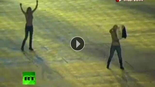 Euro 2012 açılışını stadyumda sahaya atlayarak protesto eden bir grup kıza polis müdahalede bulundu. Kızlar protestoyu üstlerini çıkartarak yaptılar.