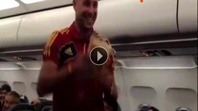 EURO 2012 şampiyonu İspanya'da dönüş yolu oldukça eğlenceli geçti. Uçakta emniyet kurallarını Pepe Reina gösterdi.