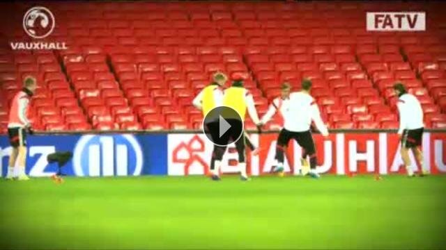 Hazırlık maçında İngiltere ile karşılaşacak olan Almanya hazırlıklarını sürdürürken Arsenal'in savunma oyuncusu Per Mertesacker rabona vuruşu ile 5'e 2 çalışmasına renk kattı.