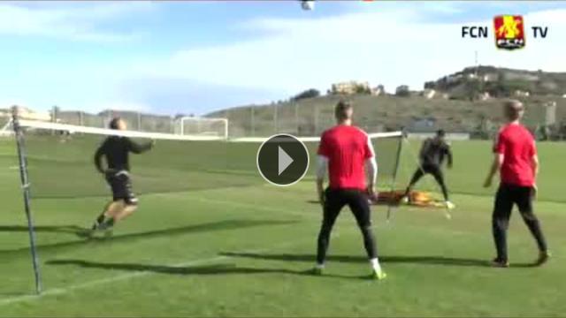 Danimarka Süper Ligi ekiplerinden Nordsjaelland'ın antrenmanda ayak tenisi oynadığı sırada kaleci Martin Hansen'in müthiş röveşatası oyuna damga vurdu.