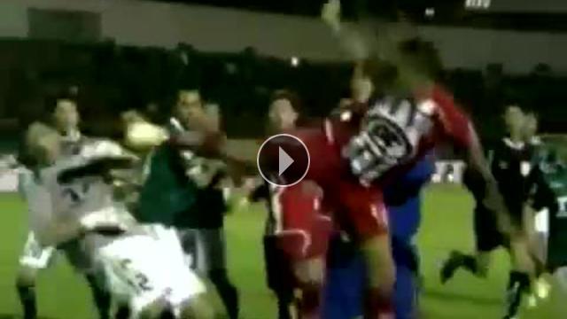 Şili'de Santiago Wanderers'ın Union La Calera'yı konuk ettiği maçın 90. dakikasında kırmızı kartla oyundan atılan Gaston Cellerino, üstüne doğru gelen kaleci Viana'yı karate tekniklerini aratmayacak bir tekme ile yere serdi.