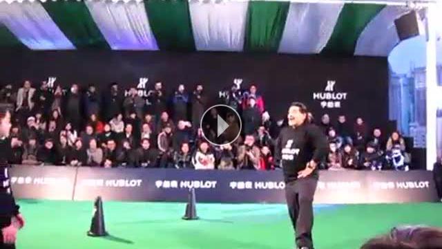 Çin'in en büyük kenti Şanghay'a ziyarete giden Maradona bir yardım organizasyonuna katıldı. Organizasyonda yarışma düzenleyen Maradona çocuklara topa nasıl vurmaları gerektiğini de gösterdi.