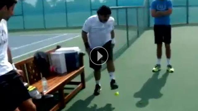 Diego Armando Maradona, erkekler tenis dünya sıralamasının bir numası Sırp raket Novak Djokovic'e tenis topunu nasıl sektireceğini gösterdi.