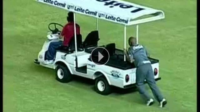 Brezilya'da Sport ile Belo Jardim arasında oynanan maçta bir futbolcunun sakatlanması ile sahaya giren sağlık aracı sahada bozulunca futbolcular tarafından saha dışına itildi.