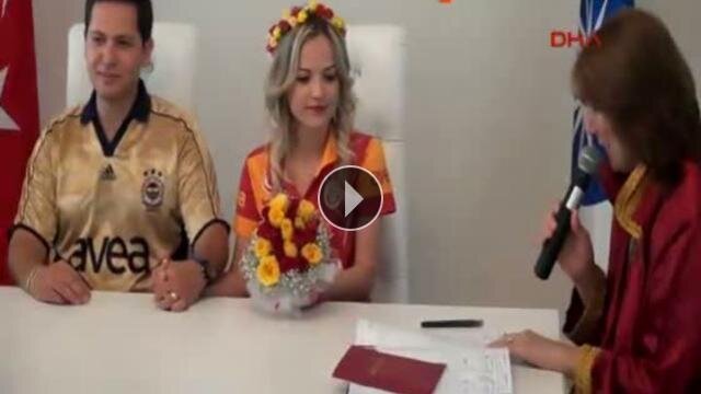 Antalya'da, Galatasaray taraftarı Hacer Kapsız ve Fenerbahçe taraftarı Onur Çareci, gelinlik ve damatlık yerine hayranı oldukları takımların formalarını giyerek nikah masasına oturdu....