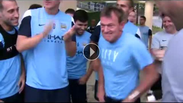 İngiltere Premier Lig ekiplerinden Manchester City'de antrenör Les Chapman, oyuncuların ısrarına dayanamayarak kendini yağmurdan göle dönmüş sahaya fırlattı.
