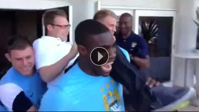Manchester City'nin yıldız oyuncuları Joe Hart, James Milner ve Micah Richards basın sözcüsü Sam Cooke'u karga tulumba havuza attı.