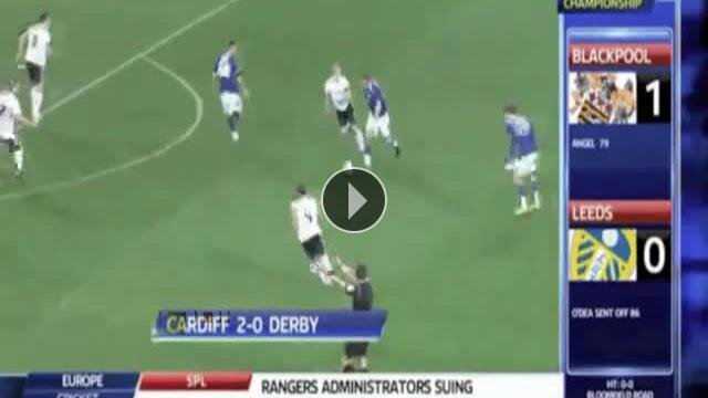Cardiff City'nin başarılı futbolcusu Mark Hudson kendi yarı sahasından yaptığı vuruşla Derby kalecisini avladı.