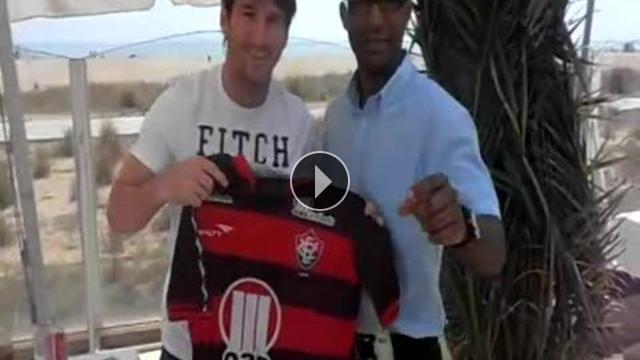 Dünyanın en iyi futbolcusu olarak gösterilen Lionel Messi'ye tatilini yaptığı otelde yemek yerken bir hayranı tarafından Brezilya'nin Vitoria takımının 10 numaralı forması hediye edildi.