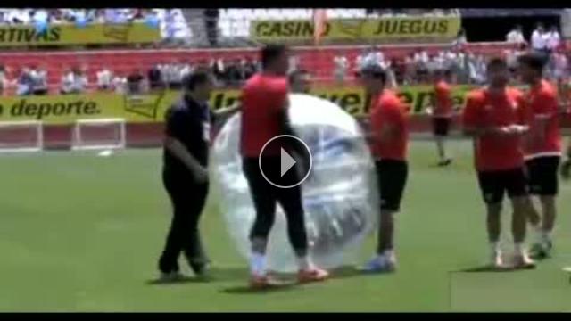 Bir eğitim programı için Sevilla Ramon Sanchez Pizjuan Stadı'nda toplanan Sevilla takımında futbolcular Jose Antonio Reyes'i dev bir plastik topun içine koyarak tekmelediler.