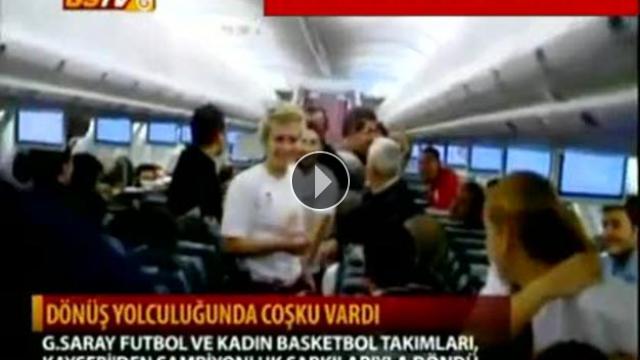 Galatasaray Futbol ve Kadın Basketbol Takımları Kayseri'den şampiyonluk şarkılarıyla dönerken uçağın neşe kaynağı yine Sabri Sarıoğlu oldu...