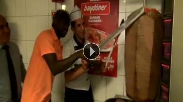 Gaziantepspor Teknik Direktörü Bülent Uygun ile kırmızı siyahlı futbolcular, katıldıkları bir dönerci dükkanının açılışında döner kestiler.