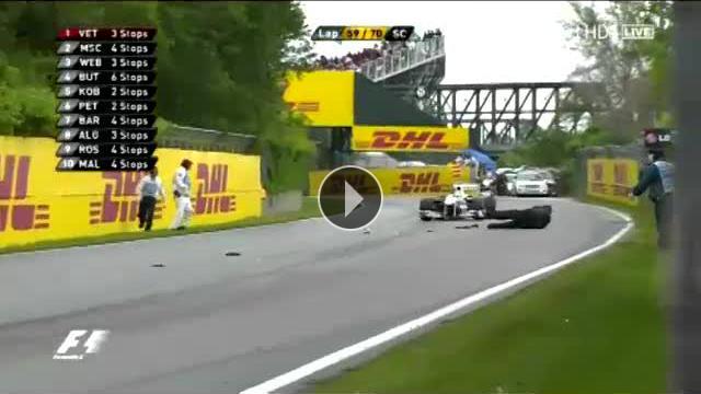 Son yılların en çekişmeli ve zevkli mücadelelerinden birisine sahne olan Kanada Grand Prix'inde ilginç bir olay yaşandı. Yarışın 59. turunda kaza yapan Heidfeld'in otomobilinden yayılan parçaları toplamak isteyen görevli az kalsın eziliyordu.