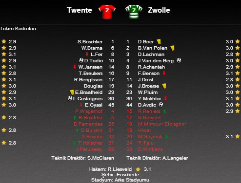Hollanda Eredivisie'nin 14. haftasında Twente, De Grolsch Veste Stadyumu'nda Zwolle'yi konuk etti. Mücadele takımların karşılıklı golleriyle 2-2 berabere bitti.