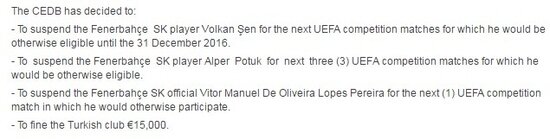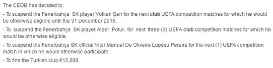 Bilindiği üzere olaylı Braga maçında kırmızı kart gören Fenerbahçeli oyunculardan Volkan Şen'e 2016 yılı sonuna kadar ve Alper Potuk'a ise 3 maç ceza gelmişti. UEFA, Volkan ve Alper için ilk açıklamasında kulüp detayını belirtmemişti ve oyuncuların cezalarını UEFA karşılaşmalarında çekeceği belirtilmişti. Ardından aynı açıklamada yapılan düzeltmede 'UEFA kulüp müsabakaları' ifadesi koyu renkli bir şekilde eklenerek oyuncular için çıkan 'EURO2016'yı kaçırabilir mi?' sorusunu da kafalardan silindi.