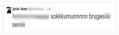 "A……a sokkkumunnnnn brugesiiiii seniiii" yazan Sezer’e bir çok kişiden tepki tweeti geldi. Daha sonra ünlü oyuncu bu tweeti kişisel hesabından kaldırdı.