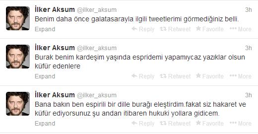 — İlker Aksum (@ilker_aksum) November 23, 2013 Sarı kırmızılı taraftarların kendisine verdiği bazı yanıtlar üzerine Aksum, art arda attığı tweetlerde, "Bana bakın, ben esprili bir dille Burak'ı eleştirdim. Fakat siz hakaret ve küfür ediyorsunuz, şu andan itibaren hukuki yollara gideceğim. Burak benim kardeşim yaşında, espride mi yapamayacağız, yazıklar olsun küfür edenlere. Benim daha önce Galatasaray ile ilgili tweetlerimi görmediğiniz belli" ifadelerini kullanarak kırgınlığını belirtti.