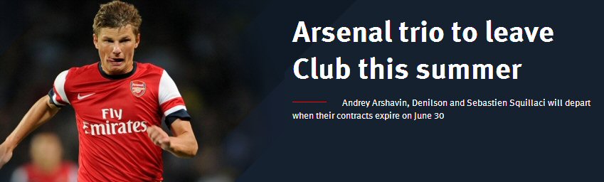 İngiltere Premier Lig ekiplerinden Arsenal, resmi sitesinden yaptığı açıklama ile 3 isimler yollarını ayırdıklarını açıkladı ve kendilerine teşekkür etti. Londra ekibinde Andrei Arshavin, Denilson ve Sebastien Squillaci gelecek sezon kadroda olmayacak.