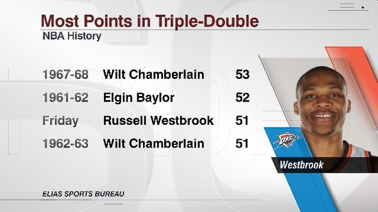 Thunder'ın yıldızı Russell Westbrook, Phoenix Suns karşısında 51 sayı atarak yaptığı triple-double ile son 30 yılda 50 ve üzeri sayı atarak triple-double yapan ilk basketbolcu oldu.