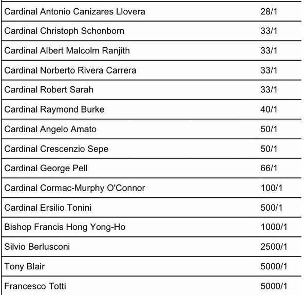 Görevinden ayrılacağını açıklayan Katolik Hristiyanların ruhani lideri Papa 16. Benediktus'un yerini kimin alacağı henüz belli olmadı. Bunu fırsata çevirmeye çalışan uluslararası bahis siteleri ise yeni Papa'nın kim olacağına dair bahisler açtı, oranları belirledi.
