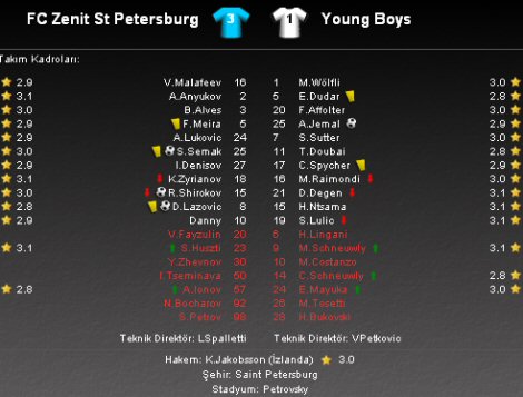 UEFA Avrupa Ligi 2. Tur rövanş maçında Zenit ile Young Boys Rusya'da karşı karşıya geldi. Temposu bir an olsun düşmeyen ve büyük bir heyecana sahne olan karşılaşmada kazanan taraf 3-1'lik skorla Zenit oldu.