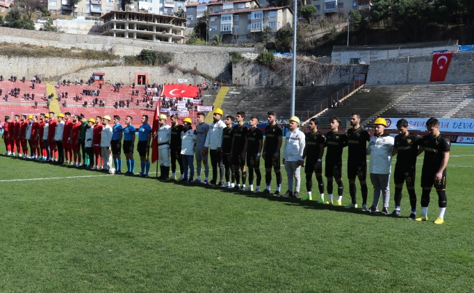 Öte yandan sahaya "Yaraları birlikte saracağız." ve "Birlikte güçlüyüz." yazan pankartlarla çıkan futbolcular, maden işçileriyle saygı duruşunda bulundu, İstiklal Marşı okudu.